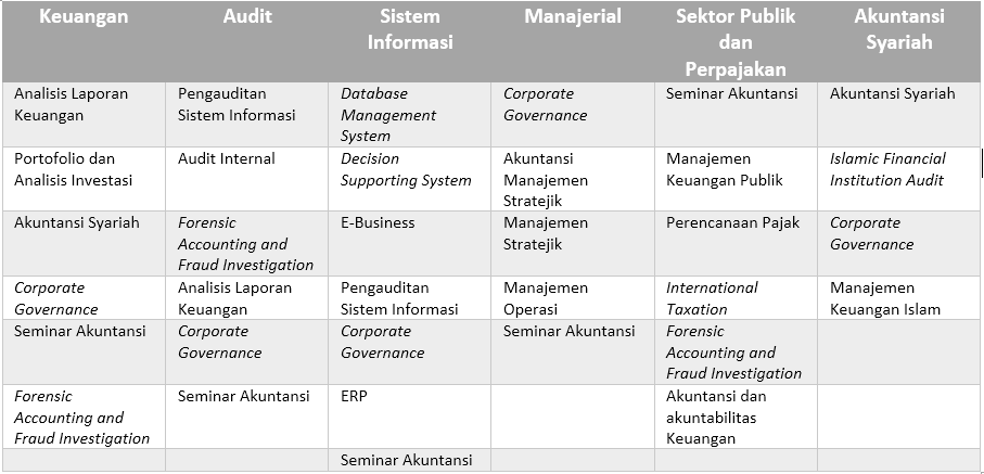 Oiya, untuk konsentrasi akuntansi di UGM itu ada 6. Penjurusan dipilih sesuai dengan mata kuliah pilihan yang diambil. Gak menutup kemungkinan kok kalo mau konsentrasi >1. Nah, penjurusan dan saran mata kuliah pilihan bisa diliat di tabel ini ya :